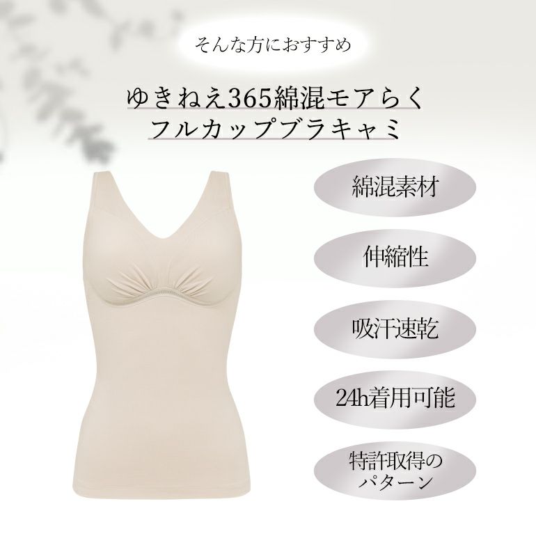 伸縮性に優れ、吸汗性・速乾性を備えた綿混素材「ナイロン綿ベア天竺*」を使用した、ゆきねえシリーズの補整ノンワイヤーブラキャミです。心地良くボディにフィットして365日快適な着心地です。