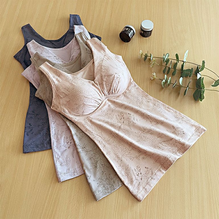 伸縮性に優れ、吸汗性・速乾性を備えた綿混素材「ナイロン綿ベア天竺*」を使用した、ゆきねえシリーズの補整ノンワイヤーブラキャミです。心地良くボディにフィットして365日快適な着心地です。