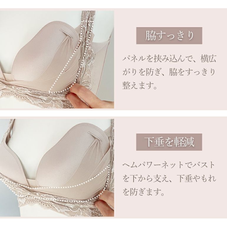 また、脇寄せ機能の引き寄せパネルを設置し、左右のパネルを前中心でつなぐことで、バストの横広がりを防止し下垂を軽減します。
