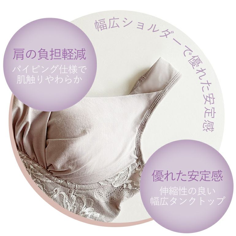 - 幅広のタンクトップ型ショルダーで、食い込みにくく優しい肌触りです。