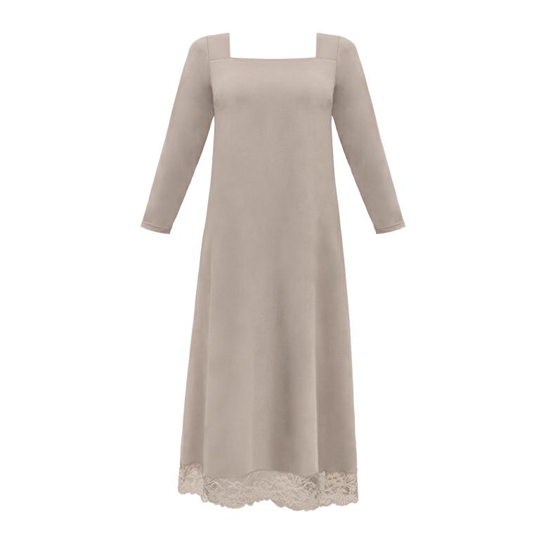 七分袖で腕をスッキリ見せ、ミモレ丈でふくらはぎを上品にカバー。ゆるやかなAラインが、お腹やお尻を自然に包み込みます。季節やシーンを問わずお召しいただけるデザインです。