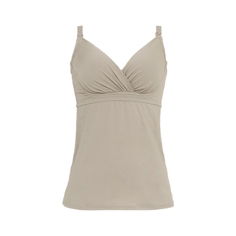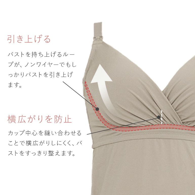 前開きのホック付きブラキャミタイプで、授乳時もラクにさっと開けられるフロントオープン仕様です。さらにカシュクールタイプなので、ずらしての授乳も可能。産後まで長く快適にお使いいただけます。