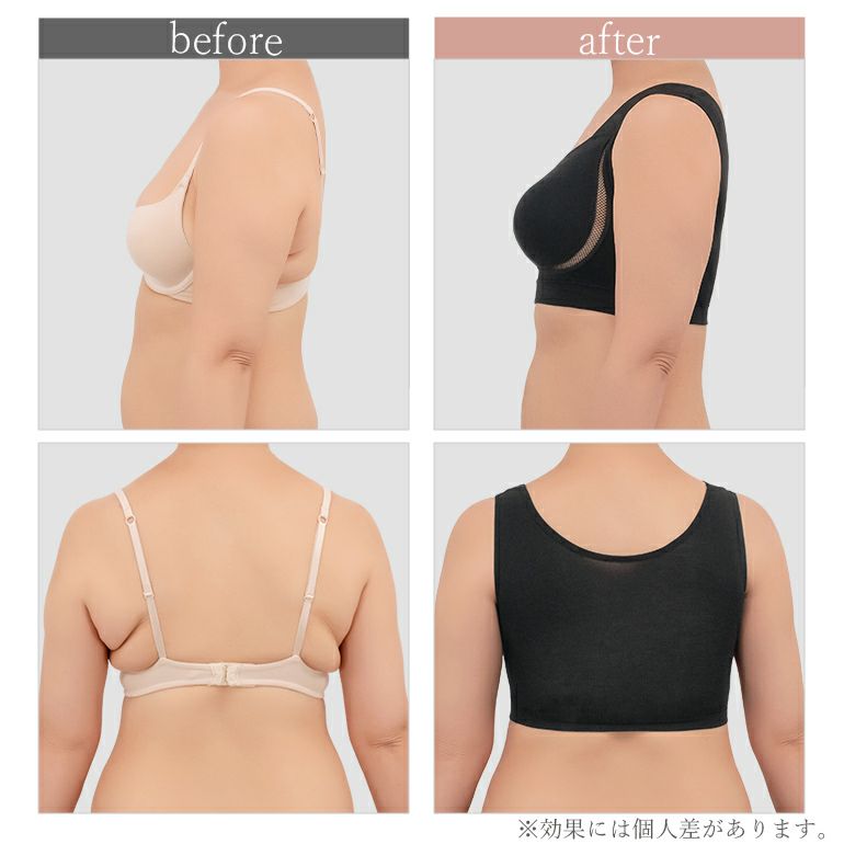 バックは、身生地一枚仕様で面で優しく支えます。幅広のタンクトップ型ショルダーは肩への負担を軽減し、良く伸びて幅広い体型にフィットします。