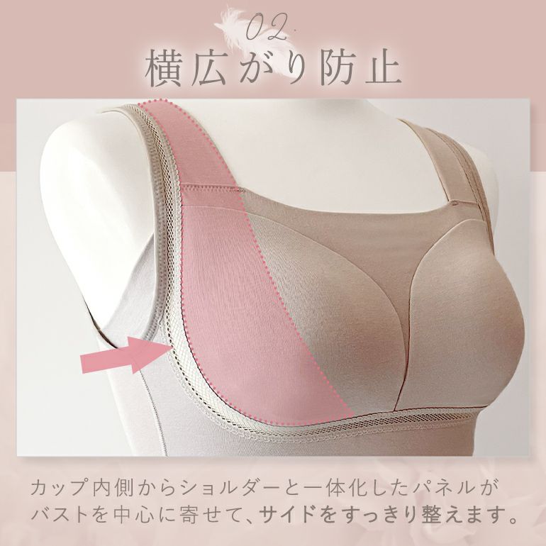 さらに、カップの内側からショルダー部分へとつながるパネルがバストを中心に寄せ、カップの横広がりを押さえてサイドをすっきり整えます。