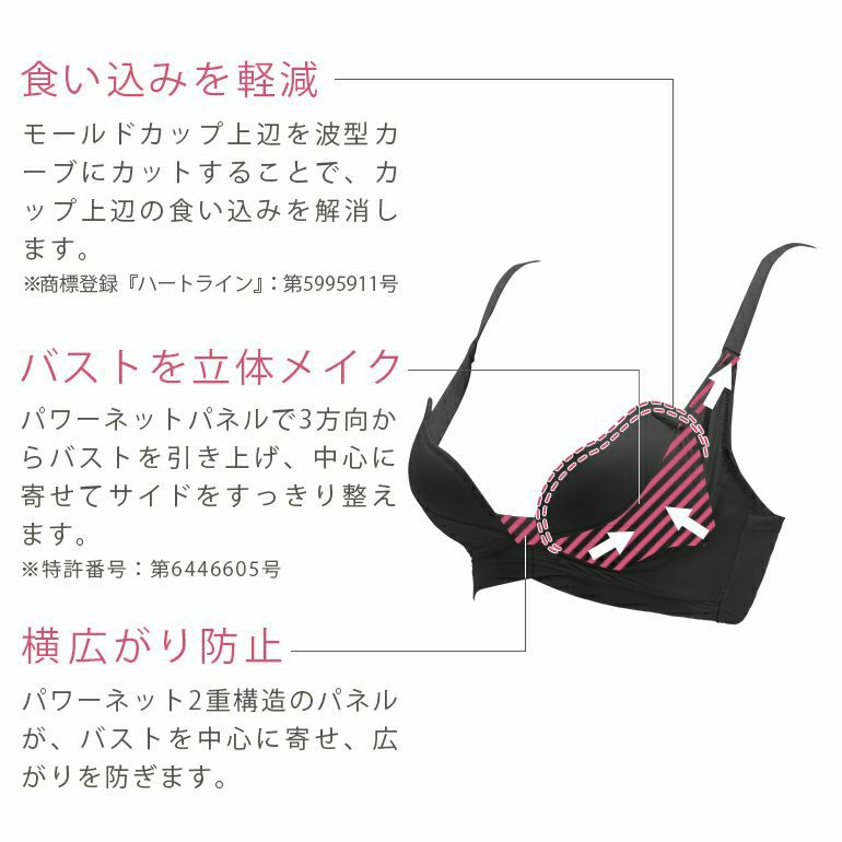 モールドカップの上辺を波型カーブ(ハートカップ)にすることでバストに沿いやすく、フィット感を高めました。また、カップに隠されたバストを引き上げる独自の機能(特許取得)でバストの横広がりを防止します。