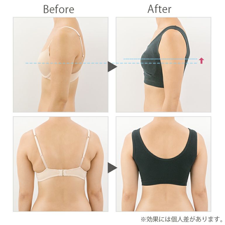 クロス設計により、バストの広がりを防止し、中央に寄せ、寝返りをしても横に広がらず、美しい形をキープし続けます。さらに、アンダーテープの幅を広げることでお胸を支え、アンダーの安定感を高めました。また、襟ぐりやアームホールを広げているため、より快適な着用感です。