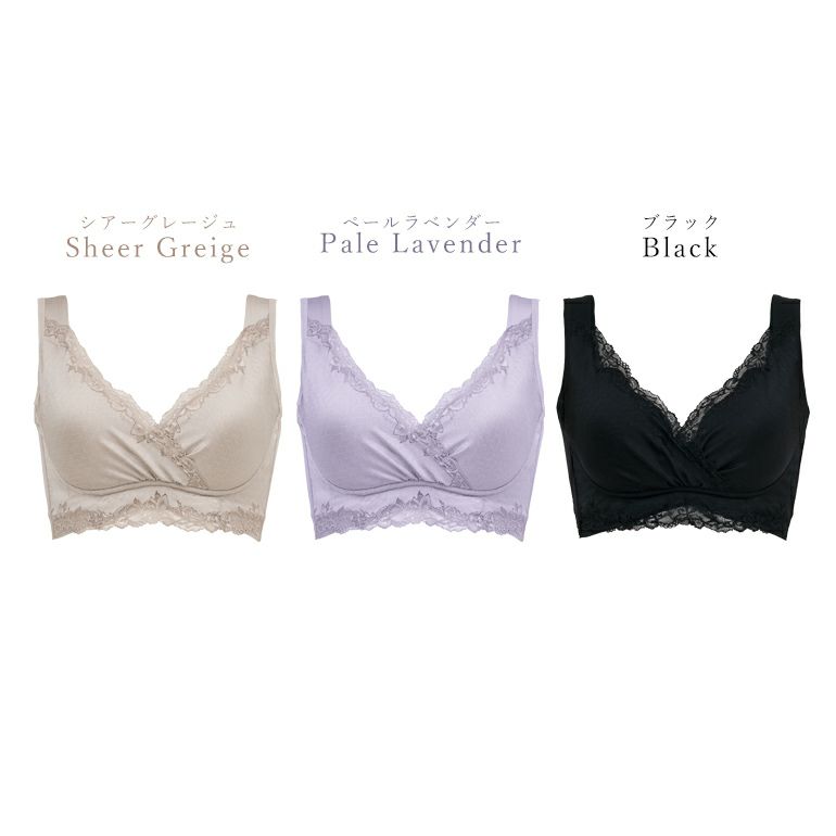 さらに、モールドカップとカップを覆うレースを縫いつけず、前中心をカシュクールデザインにすることで、様々なバストサイズにフィットします。