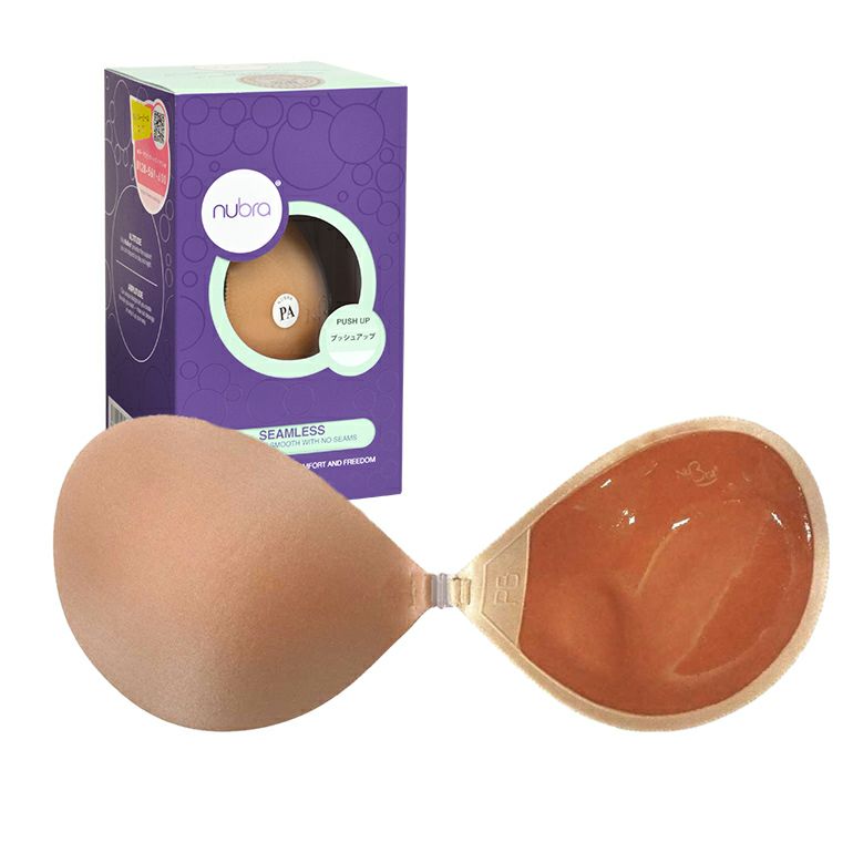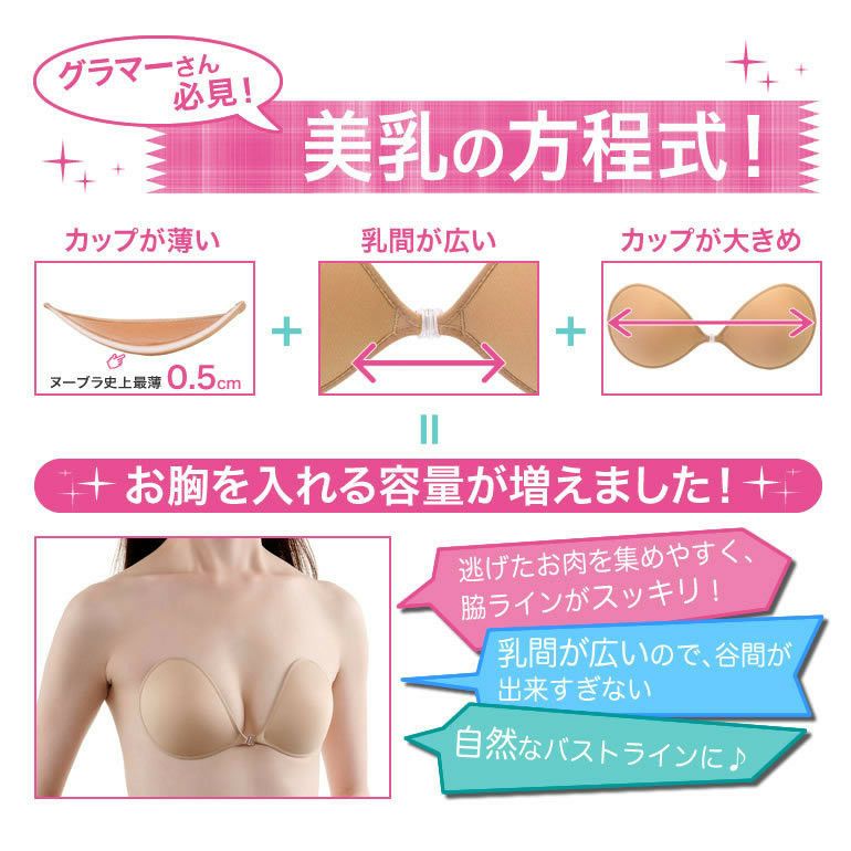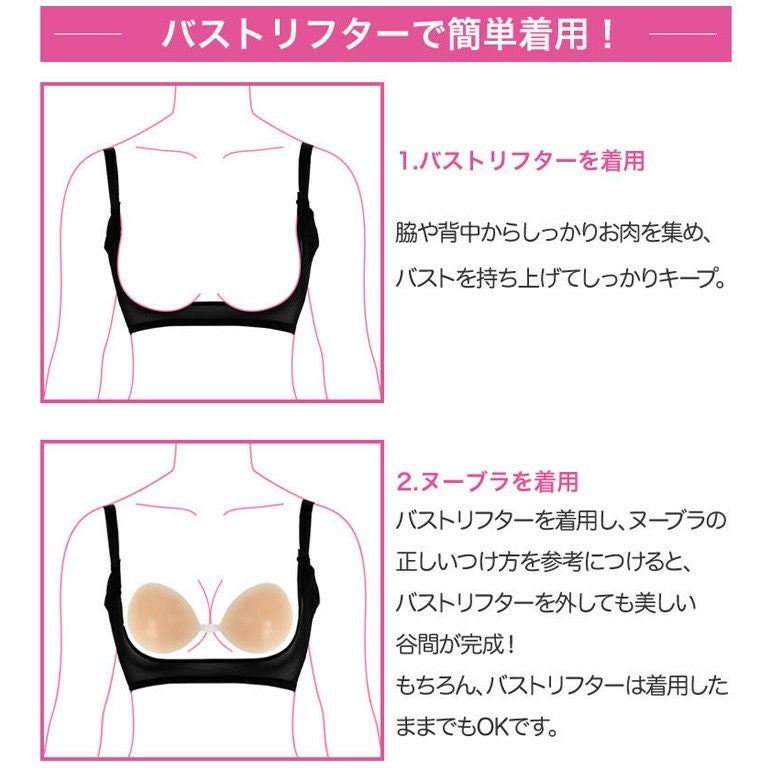 軽い着け心地でバストを寄せ上げる効果も兼ね備えた「ヌーブラ」。簡単につけられてきれいなバストの形をキープできるだけでなく、デコルテにボリュームのある、立体的なバストシルエットも実現。背中の空いた服や、ドレスなどインナーのチラ見えが気になる方、胸のラインをきれいに見せたい方におすすめです。カラーは、肌なじみの良いモカとベーシックなブラックをご用意しております。