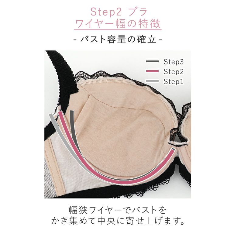 ワイヤー輪郭と乳間が狭いので、しっかりとバストを中心に寄せて、綺麗な谷間を作り、プッシュアップ機能が高い構造になっています。