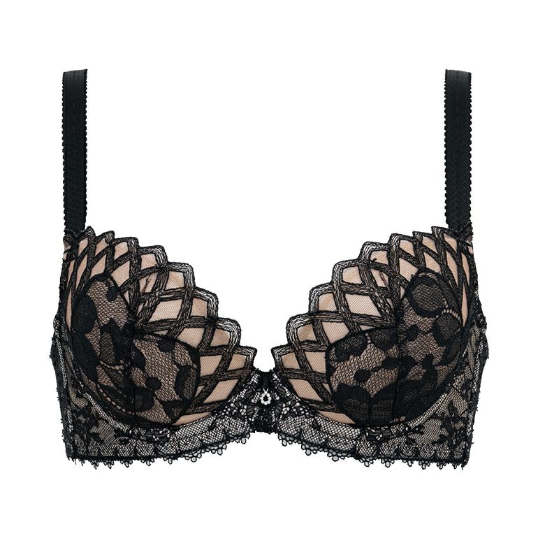 - レース縦ダーツ仕様。レース表下にトリコット*を重ねています。エンブロイダリーレース*を使用しているためカップが立ちあがりやすく、しっかりとバストを寄せ上げ、綺麗な谷間を作ります。
