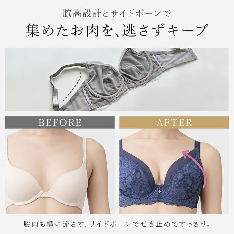 サイドの脇高設計により脇や背中に流れたお肉を集めて逃がしにくい設計で、お胸が横に広がりにくく、全体のシルエットをコンパクトに見せることができます。