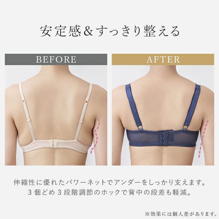 - わさ仕様*のパワーネットを使用し、食い込みや段差を解消してバストに馴染みやすく、胸元をシャープに見せます。