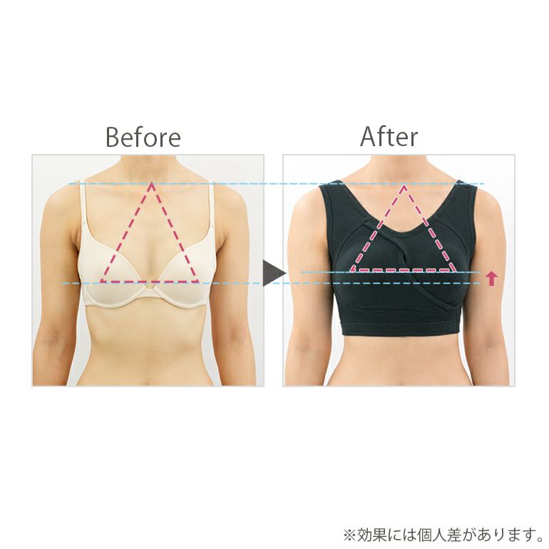 クロス設計により、バストの広がりを防止し、中央に寄せ、寝返りをしても横に広がらず、美しい形をキープし続けます。さらに、アンダーテープの幅を広げることでお胸を支え、アンダーの安定感を高めました。また、襟ぐりやアームホールを広げているため、より快適な着用感です。