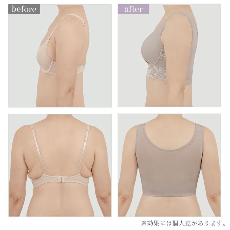 バックはUバックデザインの幅広仕様で、背中の気になるお肉をしっかりカバーし、バストの重みを面で支えることで下垂を防ぎます。
