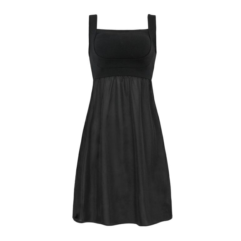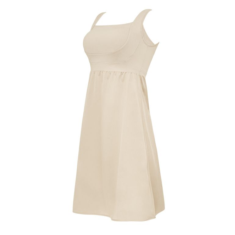 胸元は谷間見えを防ぐスクエア型で、アウターから見せる着こなしも楽しめます。