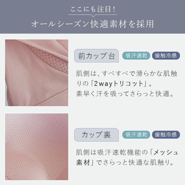 アンダーは、バージスラインに沿ってバストをぐるりと包み込み引き上げる『引き上げループ』を採用。フィット感が良く、カップのずれ上がりを軽減します。