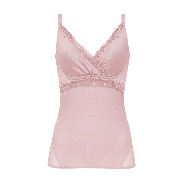 透かし編みがアクセントのオリジナルレースを使用した、補整ノンワイヤーブラキャミです。バスト全体をしっかり包み込むフルカップタイプで、バストメイクしながらボディラインも整えます。