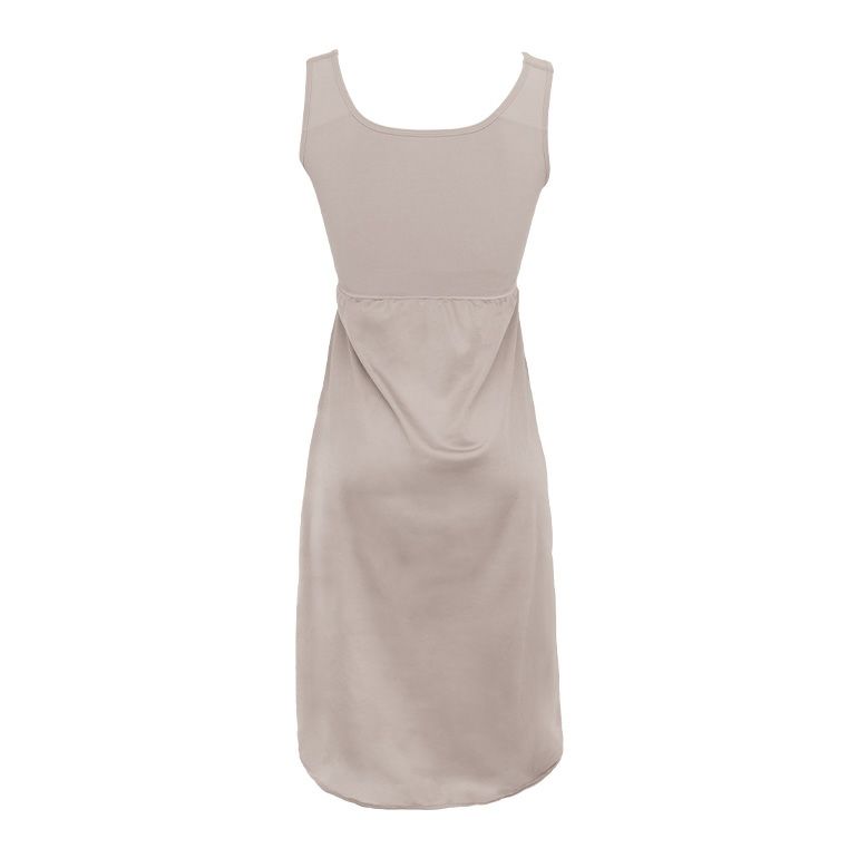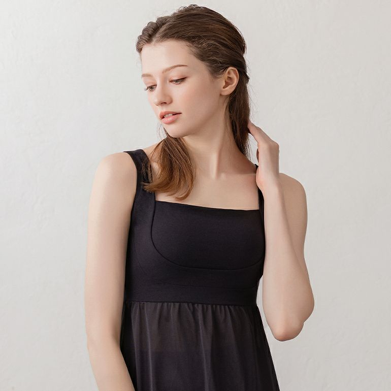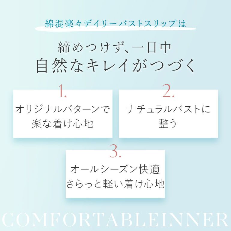 胸元は切り替えをなくし、谷間見えを防ぐストレートラインのデザインにリニューアル。スカートやワンピースから裾が出にくく、アウターに合わせやすいスリップです。