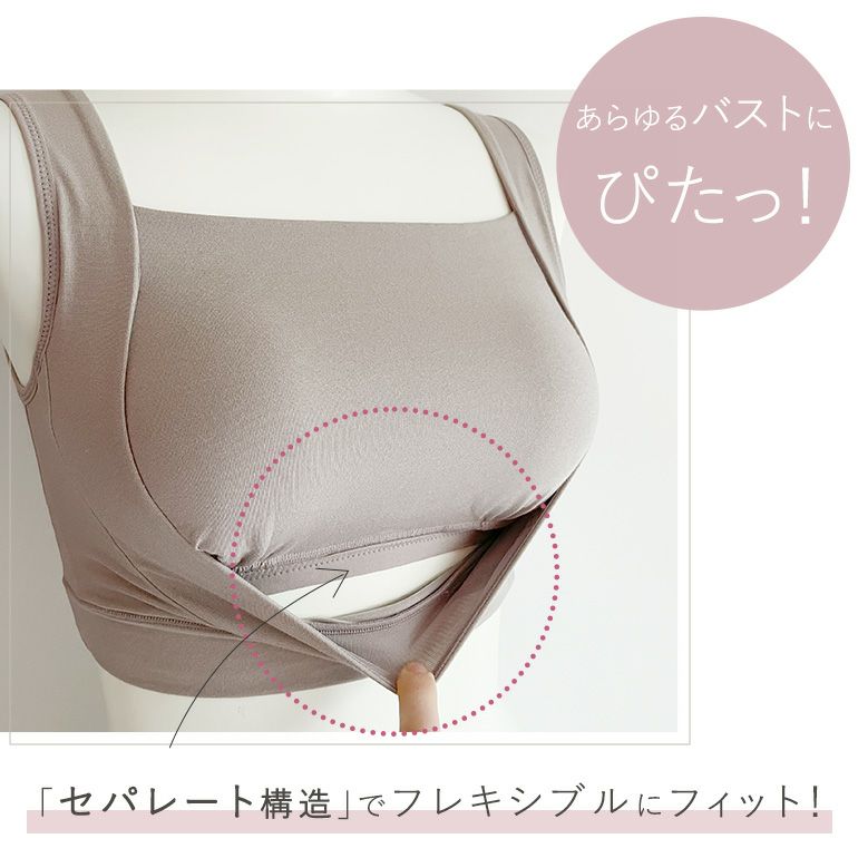 - カップ部分と吊り上げパネルを縫い付けないセパレート構造で、様々なバストサイズにフィットします。