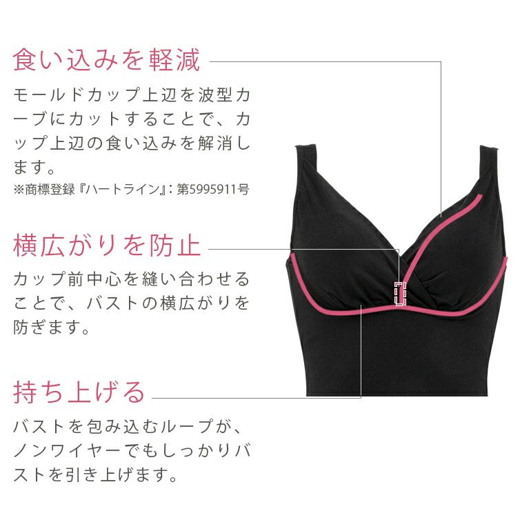 3本ラインの入ったフィット感の良いキャッチャーカップと「引き上げループ」でバストをしっかり持ち上げ、ノンワイヤーでも立体的な丸みのある美しいバストラインを実現します。