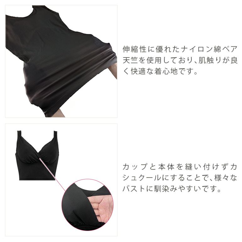 伸縮性の良いナイロン綿ベア天竺*を使用。上辺はわさ仕様*のため、食い込みを軽減し、バストにフィットします。