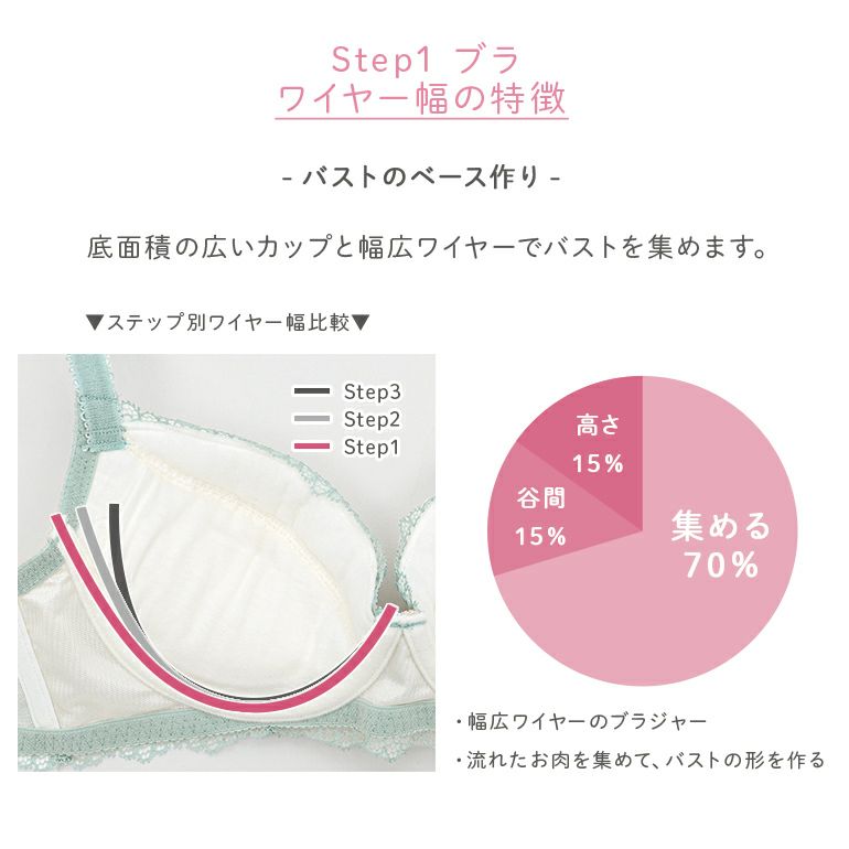Step3ブラ| タイプ | 特徴 | シルエット | 初心者度 | おすすめバスト | 脇肉スッキリ | カップの深さ | 軽めの着け心地 | |