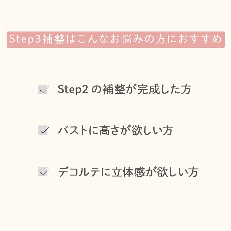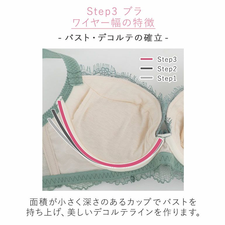 Step3ブラ| タイプ | 特徴 | シルエット | 脇肉スッキリ | 谷間メイク | デコルテメイク | カップの深さ | サイドすっきり | |