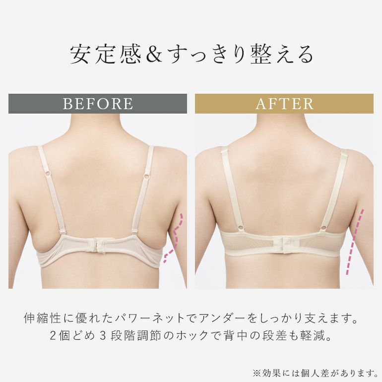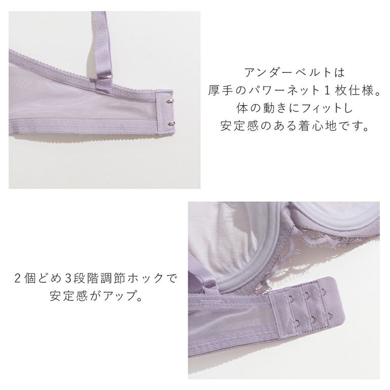 サイドの脇高設計と前浅ワイヤーが脇をすっきり整えてふんわり女性らしいバストを演出します。乳間が狭くプッシュアップ機能が高いので、しっかりとバストを集めて中心に寄せ上げ、綺麗な谷間を作ります。 谷間をしっかり作りたい方にもおすすめです。