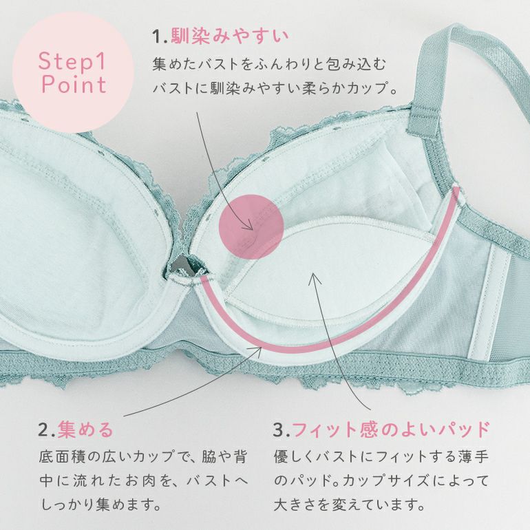 ステップ1の特徴である底面積の広いワイヤーが、集めたお肉を逃しにくく、さらに厚手の不織布を使用したふわふわカップは集めたお肉をバストとしてよく馴染ませます。非常にフィット感が良く、小さいバストの方には程よい谷間を作り、大きなバストの方はすっきりとコンパクトラインに仕上げます。