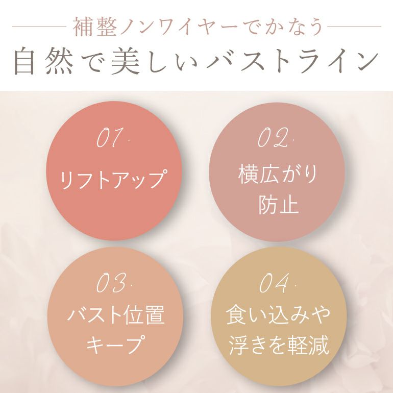 ワイヤー代わりに使用したメッシュテープがバスト周りにフィットして、効果的にリフトアップ。特許取得(※特許第5185887号)のオリジナルパターンでノンワイヤーでも美しくバストメイクします。
