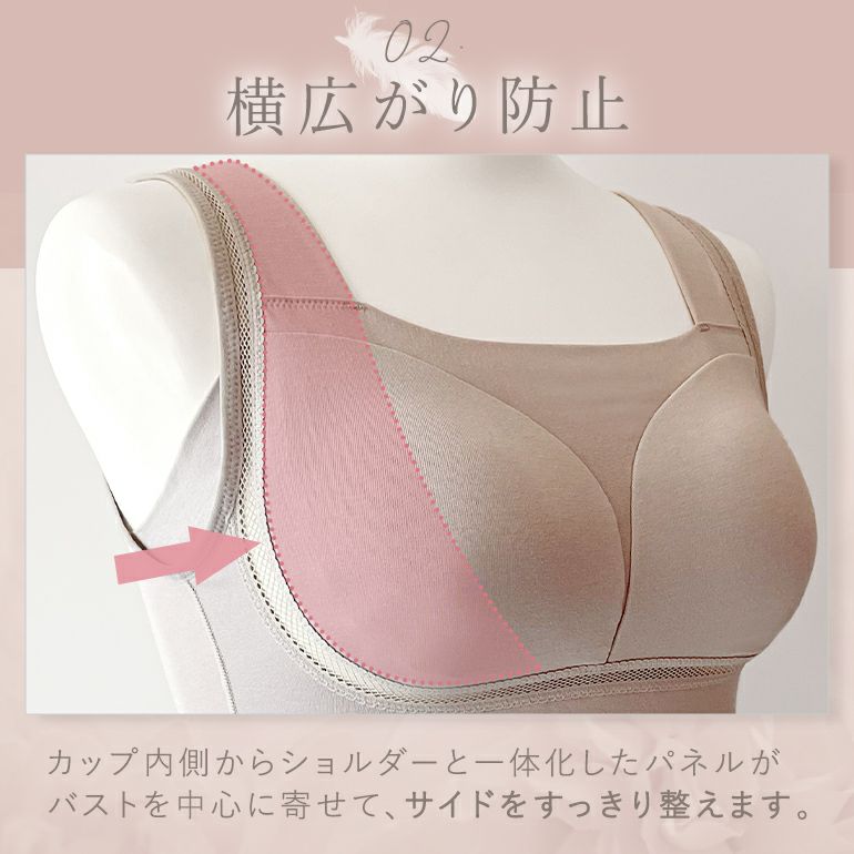 さらに、カップの内側からショルダー部分へとつながるパネルがバストを中心に寄せ、カップの横広がりを押さえてサイドをすっきり整えます。