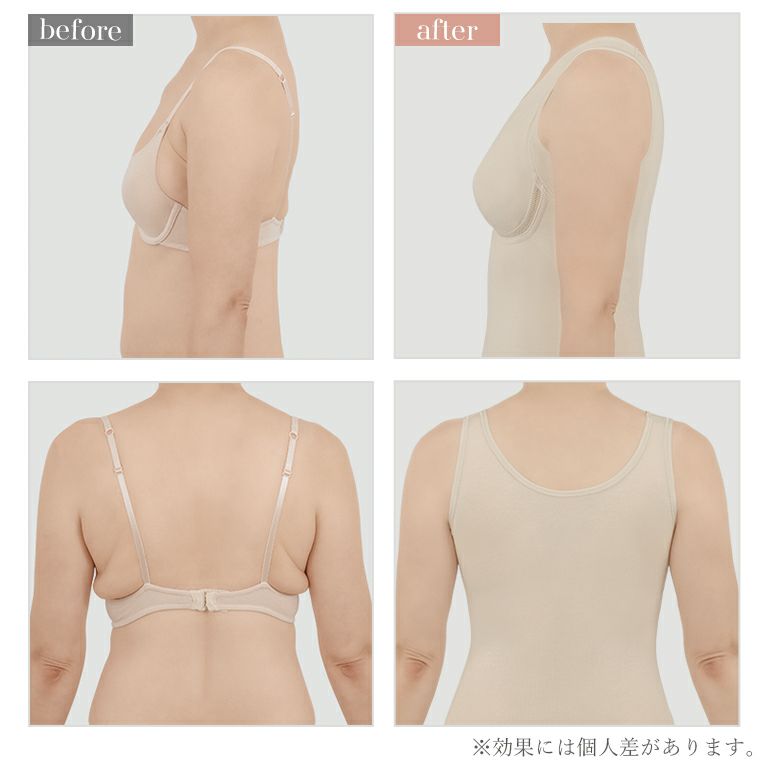背中は一枚仕立てのため、段差を軽減し滑らかに整えます。幅広ショルダーがバストの重みを面で支え、肩への負担を軽減します。