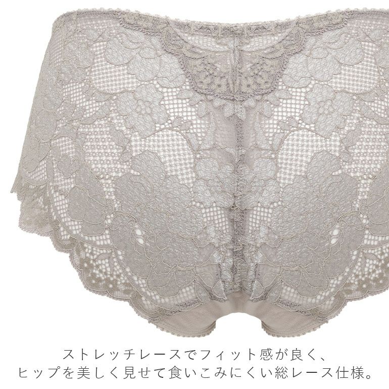 バックはフィット感の良いストレッチレースを使用。食いこみにくくヒップを美しく見せる総レース仕様です。