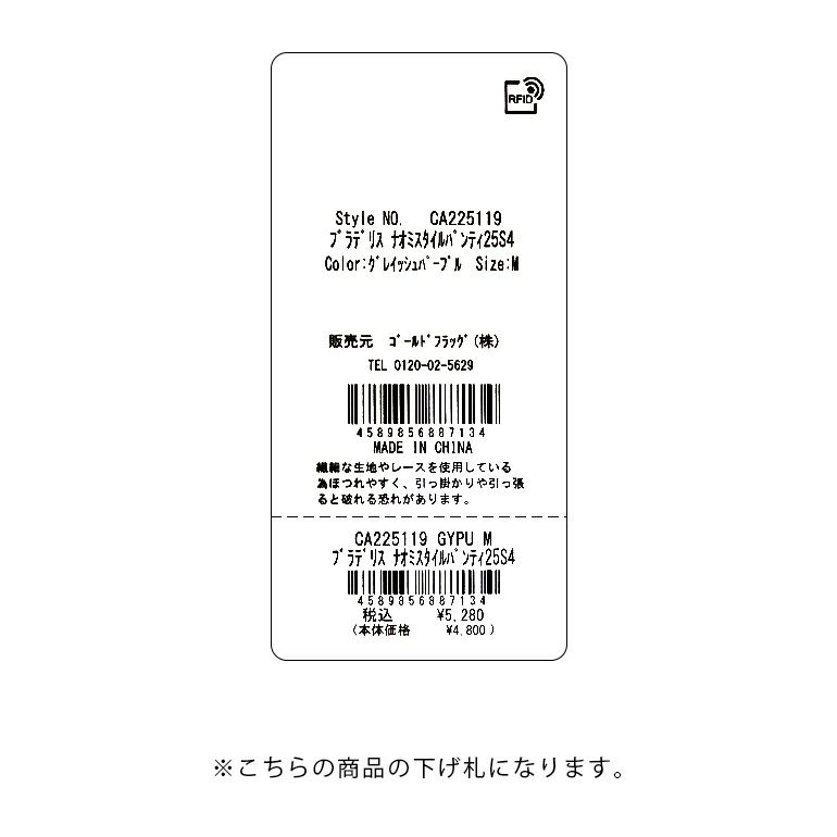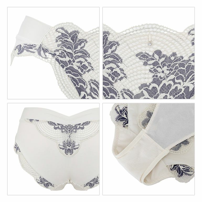 フロントの裏打ちは透け防止の為、ブラと同色のトリコット*を使用しています。滑らかなトリコット*は肌触りが良く、はき心地の良い着用感です。 前足口はレーススカラ(波形状)部分を使用しているため、食い込みを軽減します。 身生地は滑らかで伸びが良いハイゲージ2way生地を使用しています。心地よいフィット感で体の動きに馴染みやすい快適なはき心地です。 クロッチの肌側は、肌触りが良く、吸湿性の高い綿100%天竺を使用しています。 ※こちらの商品のセットアイテムはこちら