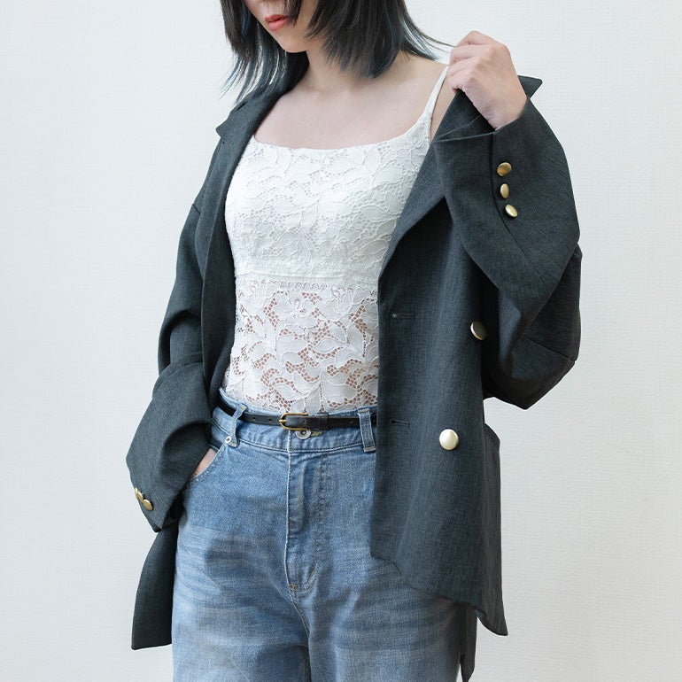 レース裏にナイロン綿ベア天竺*を重ね、透け防止と谷間カバーを両立。伸縮素材でバストの丸みを潰さず自然にフィット。