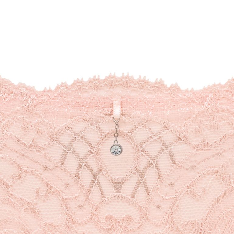 緻密なシルバーラメが美しいリバーレース*を使用した、サイドの飾りテープで華奢に仕上げたタンガです。フロント全面にあしらったレースと揺れるモチーフで、ラグジュアリーなイメージに。