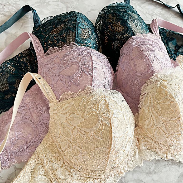 前浅ワイヤーが脇をすっきり整えて丸みのある女性らしいバストを作り、バストトップを高い位置にキープします。乳間が狭くプッシュアップ機能が高いので、しっかりとバストを集めて中心に寄せ上げ、綺麗な谷間を作ります。