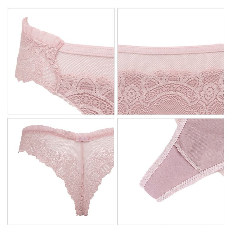 バックは、総レース仕様でヒップを美しくみせ、アウターにも響きにくいです。フロントの裏打ちは透け防止のため、ブラと同色のトリコット*を使用。滑らかな肌触りで、はき心地が良いです。