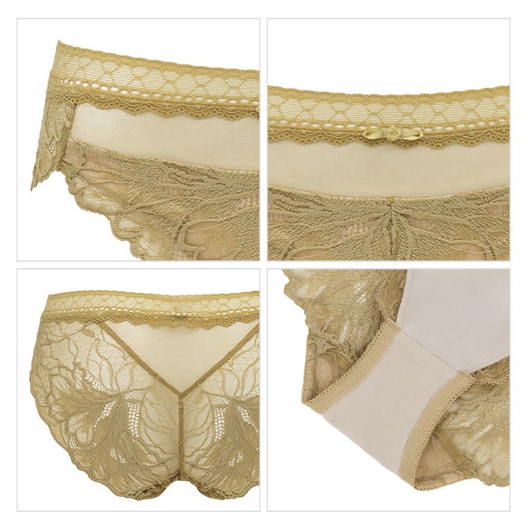 ダイナミックな大花柄と幾何学調のネット柄の組み合わせがモードな印象のストレッチラッセルレース*を使用したパンティです。 チェック柄と合わせた細巾レースを使い合わせ、程よく透け感もある華やかなデザインです。