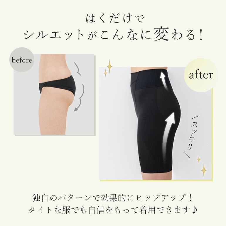また、下半分に集中的にギャザーを入れることで、ヒップアップ効果を高め、おしりの丸みをキープします。