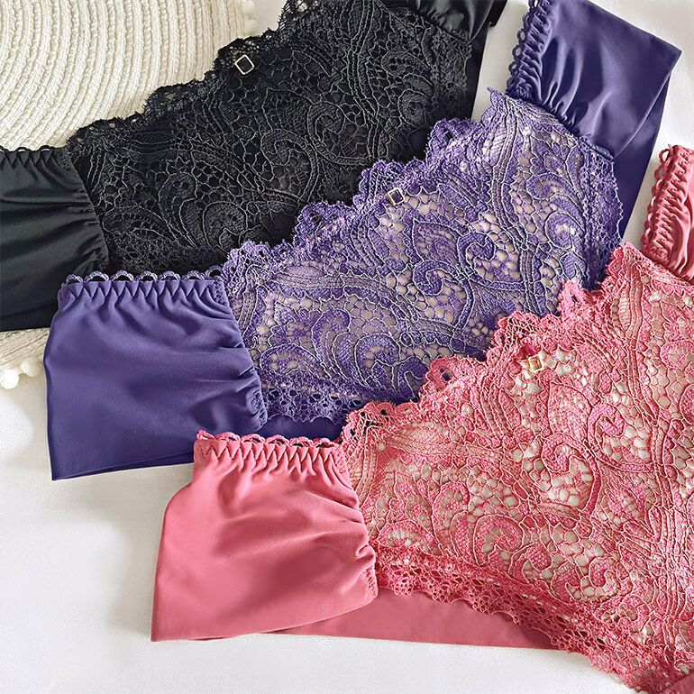 フロントの裏打ちは、透け防止の為、ブラと同色のトリコット*を使用。肌触りが良く、快適な着用感です。