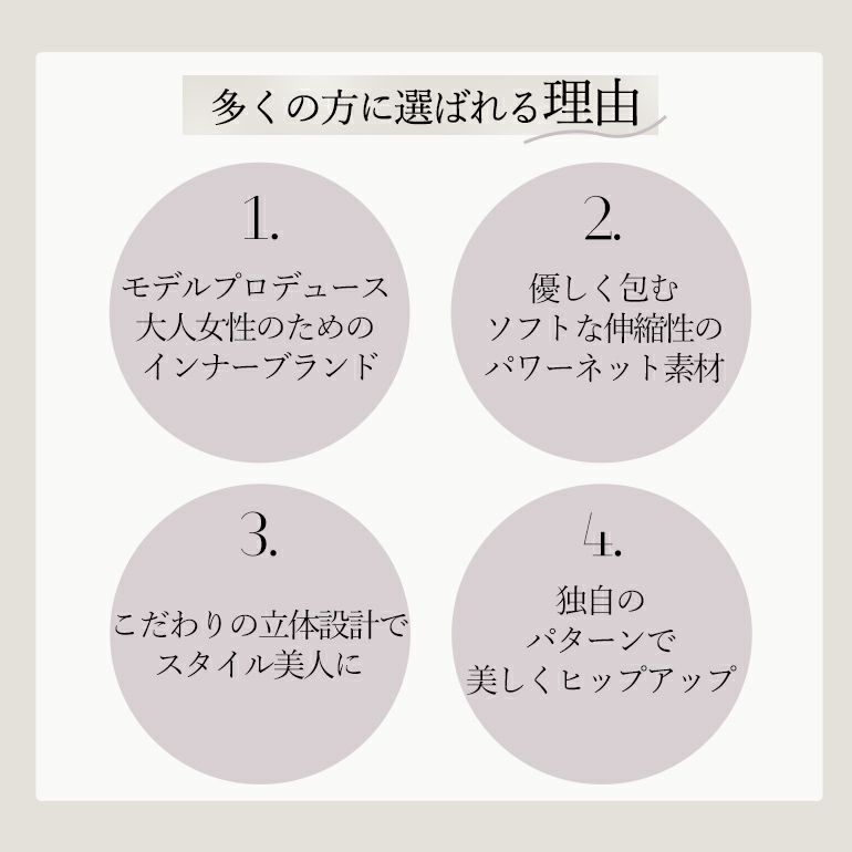 ヒップ中心のテープとギャザー、さらに下側に施したパワーネット素材のパネルにより、ヒップを下から引き上げて立体的な丸みのある美しいヒップラインを作ります。