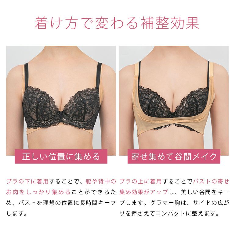 バスト下とサイドに施したパネルが、バストを持ち上げ中心に寄せます。ブラの下に着用することで、脇や背中のお肉をしっかり集め、バストを理想の位置に長時間キープします。また、ブラの上に着用することで、バストの寄せ集め効果がアップし、美しい谷間をキープします。グラマー胸はサイドをすっきりコンパクトに整えます。