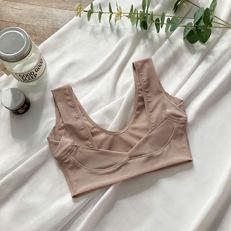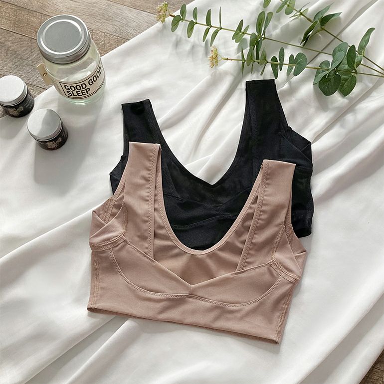 - タンクトップ型のため、調整せず着るだけでバストの位置をキープします。 幅広ショルダーで肩への負担を軽減し、体の動きにフィット。肌触りを考慮し、肩の縫い目を少し後ろにずらしています。