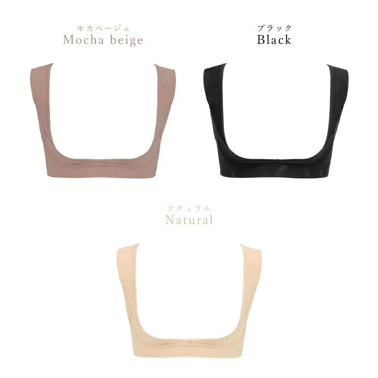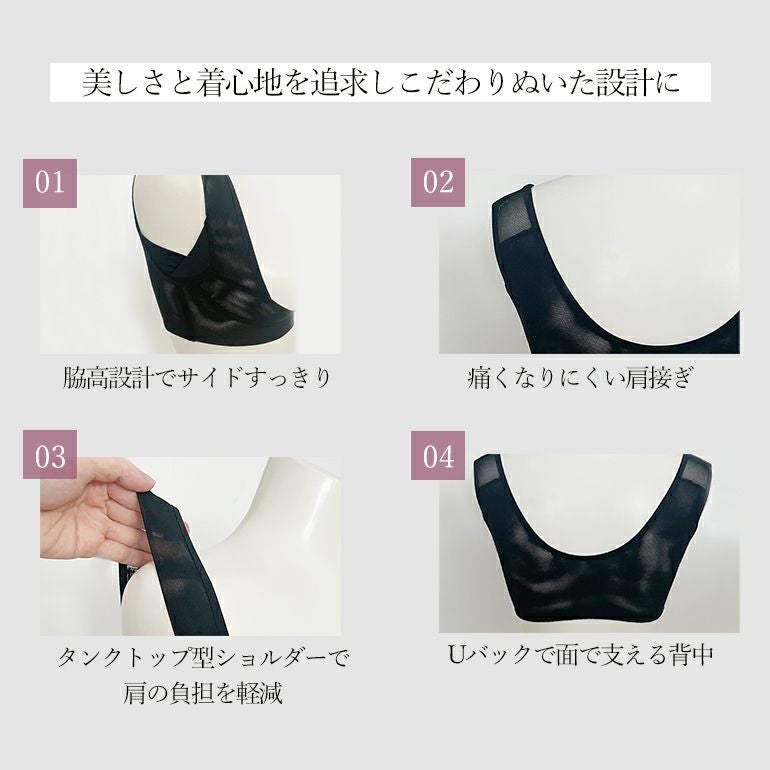 ソフトパワーネット二重構造のUバック仕様。脇から背中にかけて高めの設計で、バストの脇や背中のお肉をしっかり包み込みます。また広い面で支えるため安定感のある着心地です。下辺はフラットな仕様で肌触りが良く段差を軽減します。