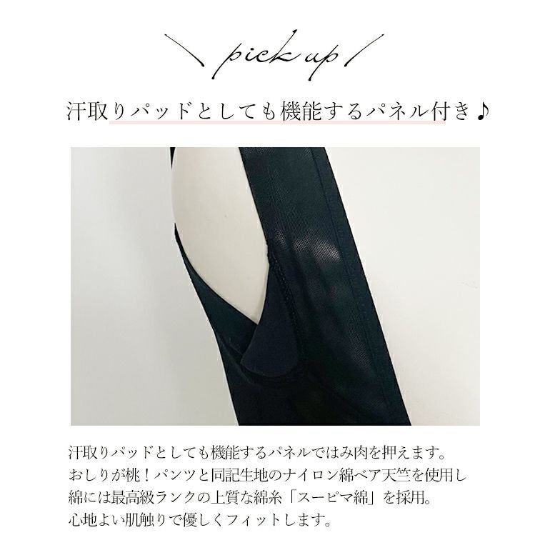 バックは、ソフトパワーネット二重構造のUバック仕様のため、脇や背中のお肉をしっかり押さえて背中をフラットに整えます。また、タンクトップ型の幅広ショルダーのため、体の動きにフィットし食い込みにくく安定感があります。