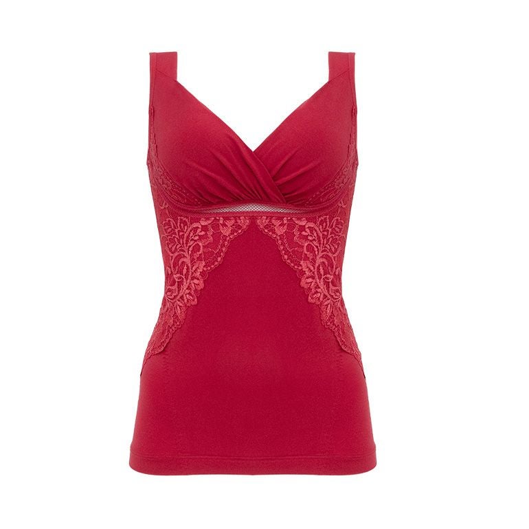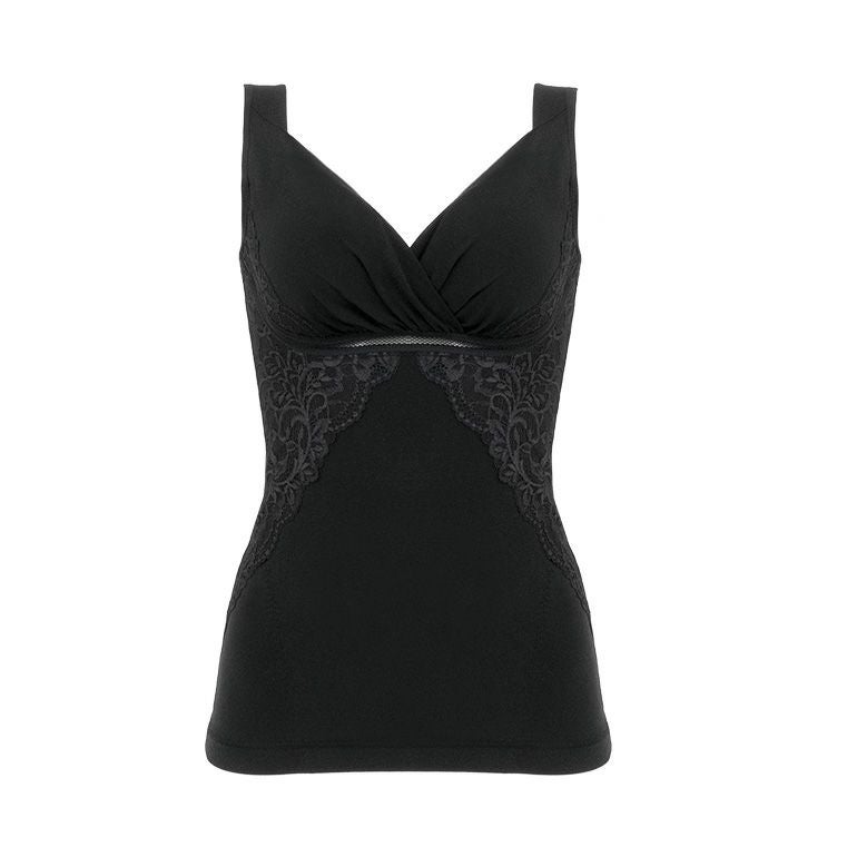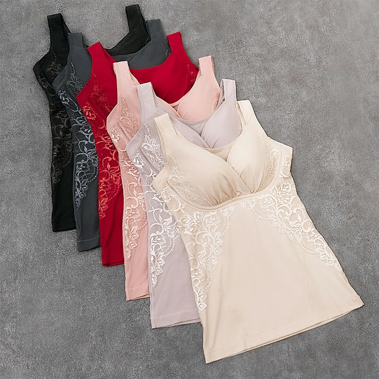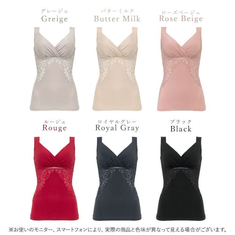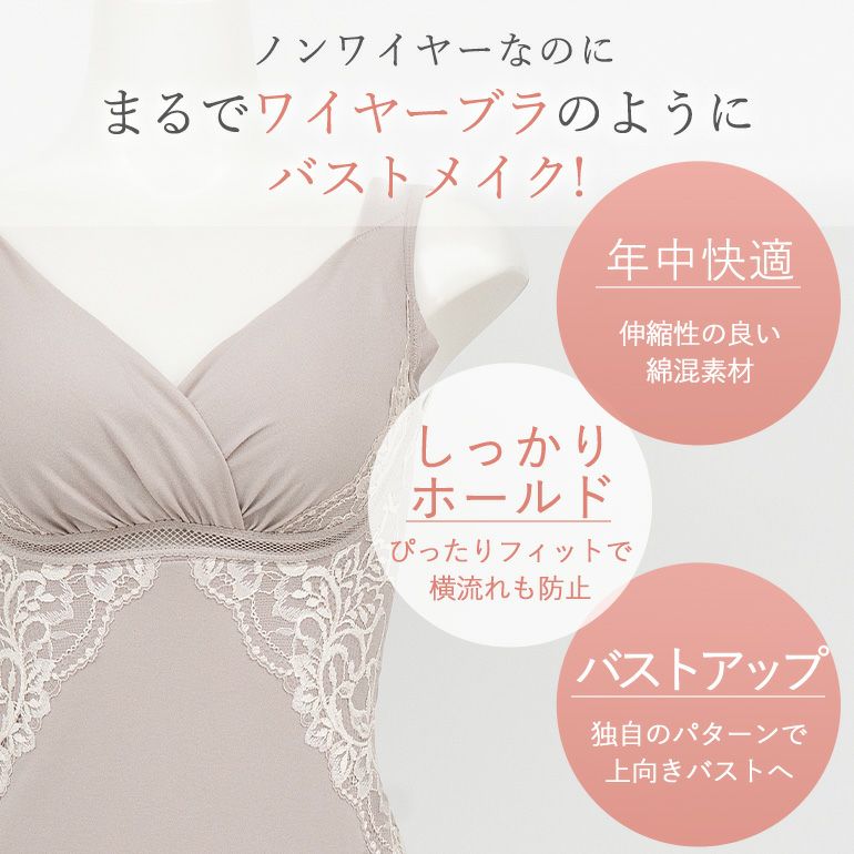 刺繡のような存在感のある二浴染め*光沢落下板ストレッチレースをふんだんに使用した、補整ノンワイヤーブラキャミです。
