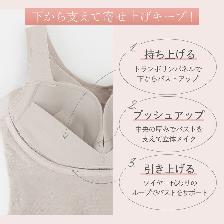 - 折り返した身生地にパワーネットを挿入した三重構造で、引き上げ力をサポート。肩接ぎ線を後側にずらした設計で肌触りを優しくし、接ぎ部分はパワーネットを省いて柔らかさと伸縮性を向上。
