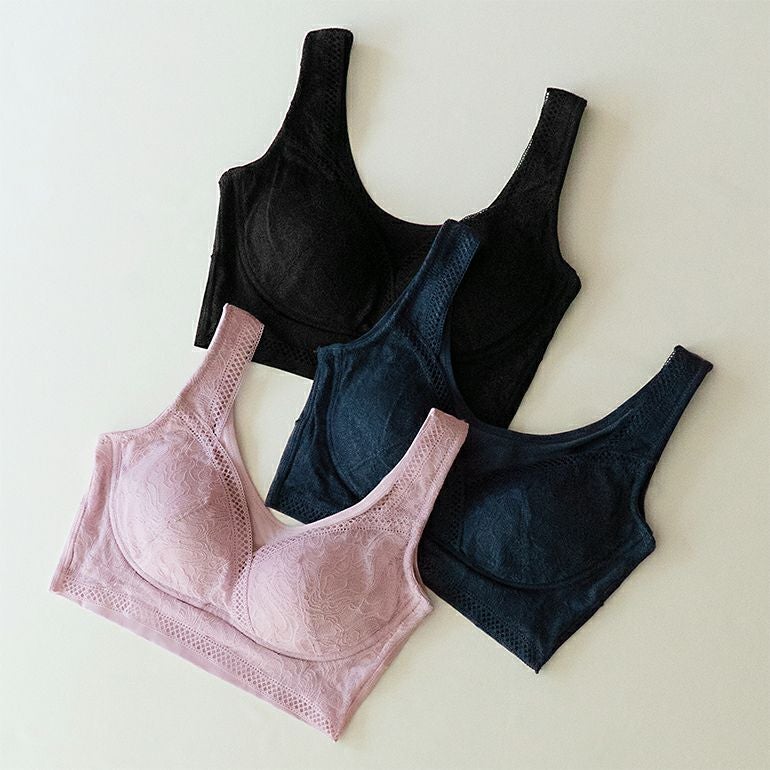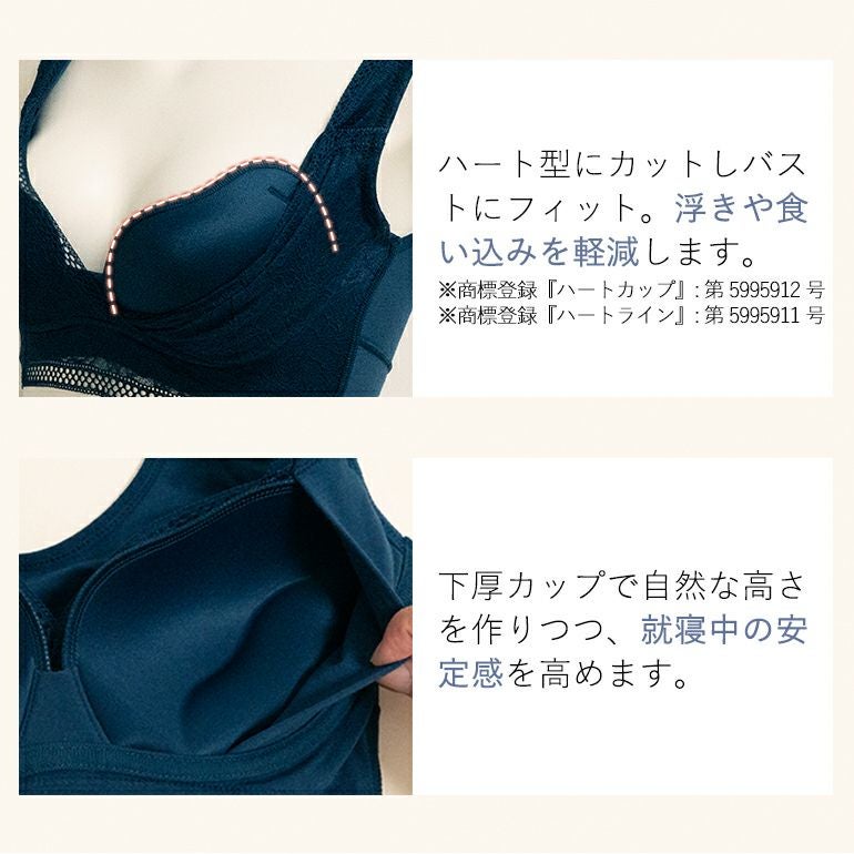 また、モールドカップと下厚プッシュアップ設計により、「カップが合いにくい/浮きやすい」といったお悩みにも寄り添い、自然な丸みと高さをつくりながら、就寝中もバスト位置が安定しやすい設計です。