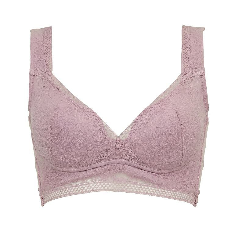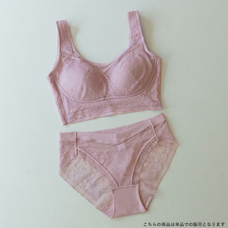 カップ・土台・前ショルダーに、繊細なストレッチラッセルレースを贅沢に使用した補整ノンワイヤーブラ。中央にはモダンな柄をあしらい、スカラ部分にははしごレースを組み合わせた、クラシカルなデザインです。